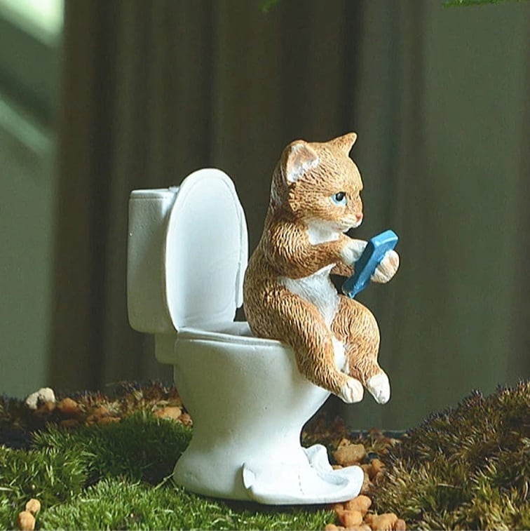 トイレ中にもスマホが欠かせないネコの置物です。