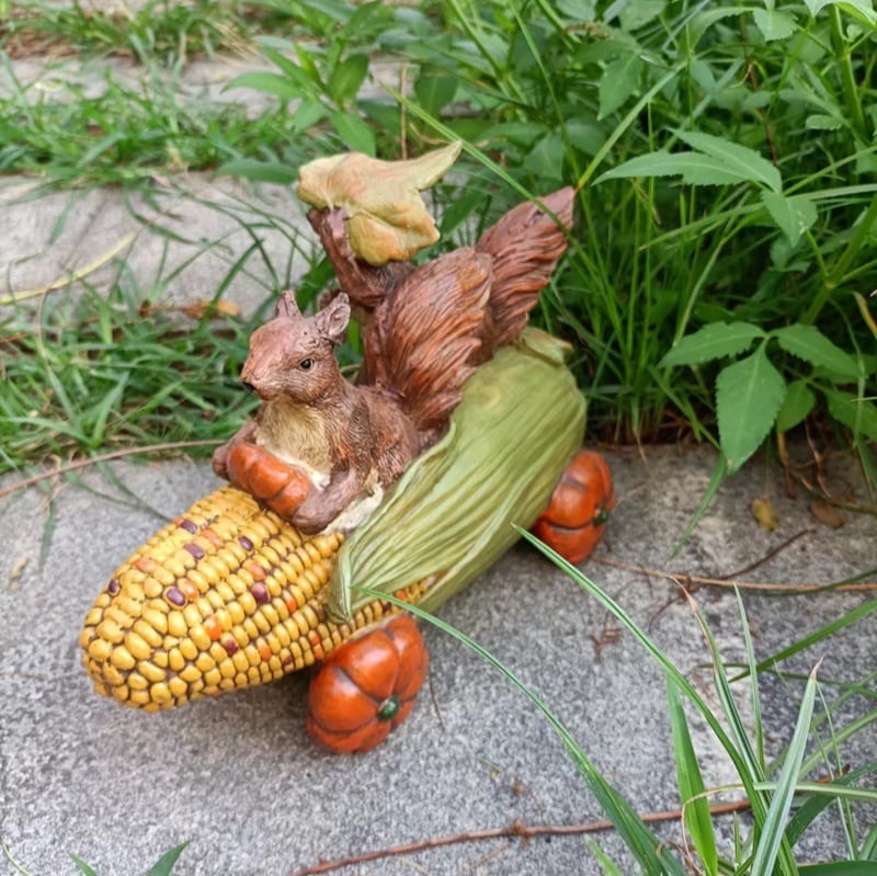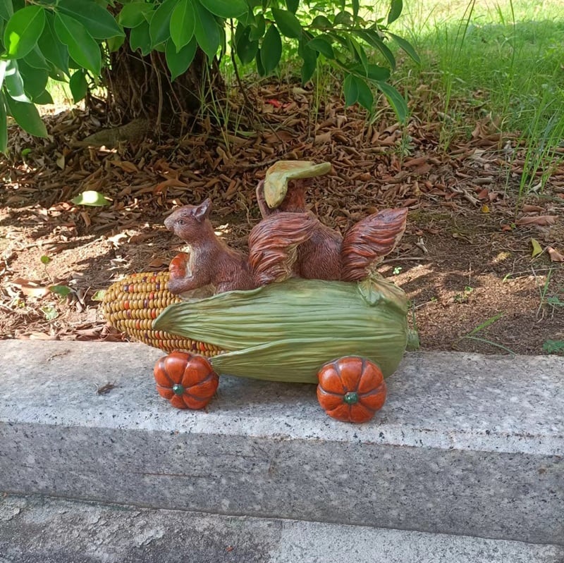 とうもろこしの車でドライブを楽しんでいるリスたちの置物